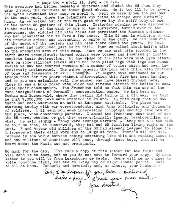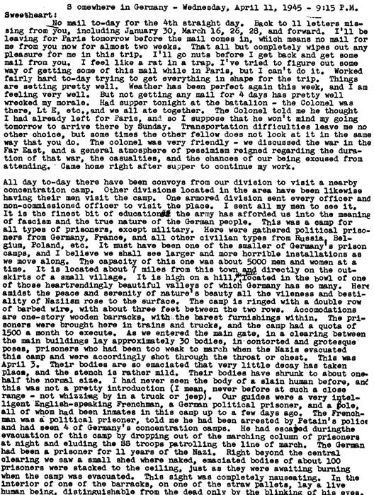 April 11, 1945, Ohrdruf: [See full handtyped letter, below] "In the interior of one of the barracks, on one of the straw pallets, lay a live human being, distinguishable from the dead only by the blinking of his eyes....Here we saw vast pits scooped in the earth where incompletely burned bodies were tossed and immersed in lime to complete their destruction. At the edge of the pits were vast pyre sites. Here on some railroad tracks which we saw the charred remains of a number of bodies which had been incompletely incinerated...Villagers have confessesd to our troops that for two years without interrruption the fire has been burning, so you can calculate well the number that has passed through here. Close by was a huge poker with which the firemen stirred the bodies to complete their consumption. The Frenchman told me that this was one of the more insignificant of Germany's concentration camps. He had been at Dachau and Buchenwald, where they really did things in a big way....There's all the difference in the world between seeing something like this and reading about it, and now millions of Americans will know, through these boys, that all we heard about the Nazis was not propaganda."